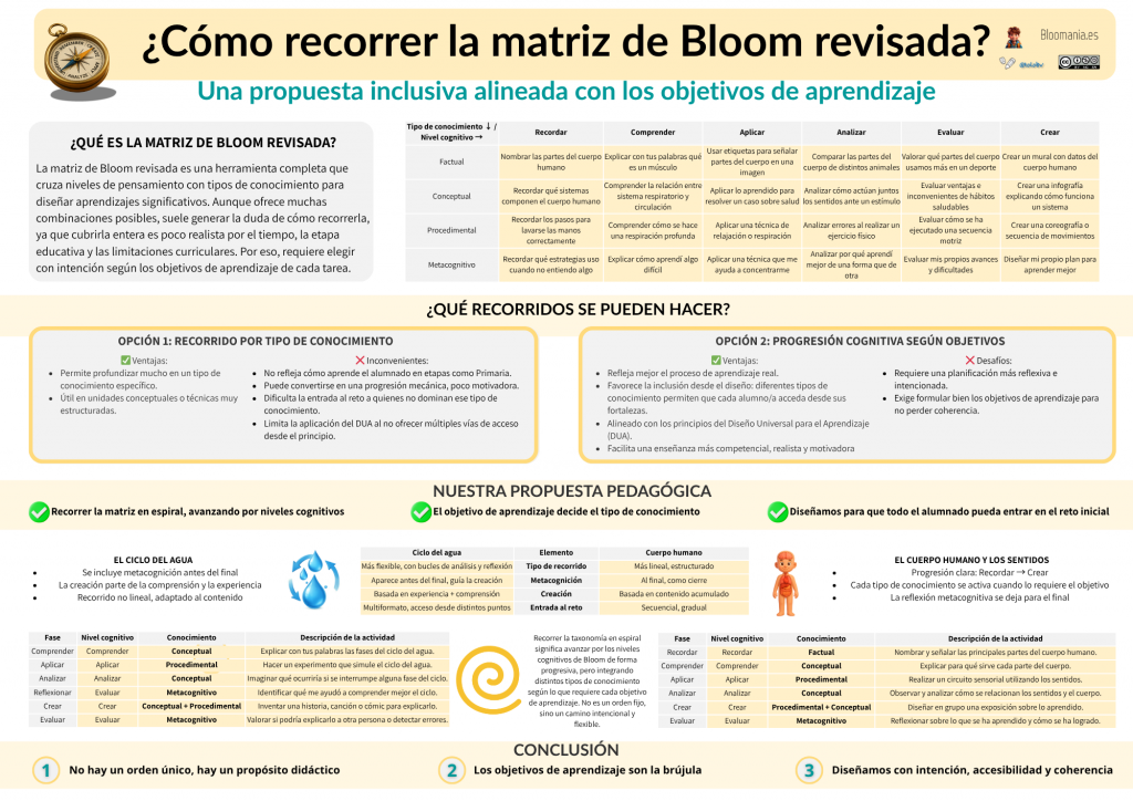 Desde una mirada inclusiva y competencial, proponemos recorrer la matriz de Bloom de forma espiral y no lineal, avanzando por los niveles cognitivos, pero activando los tipos de conocimiento en función de lo que exige cada tarea.