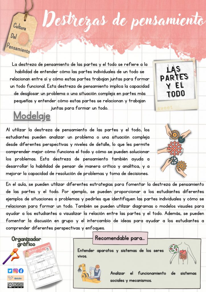 Trabajar la destreza de pensamiento de las partes y el todo les permitirá a vuestros alumnos comprender cómo los elementos de un sistema interactúan para formar un todo funcional. A través de actividades prácticas como analizar sistemas del cuerpo humano, cuentos, máquinas o sistemas sociales, esta destreza se vuelve aplicable y significativa para ellos.