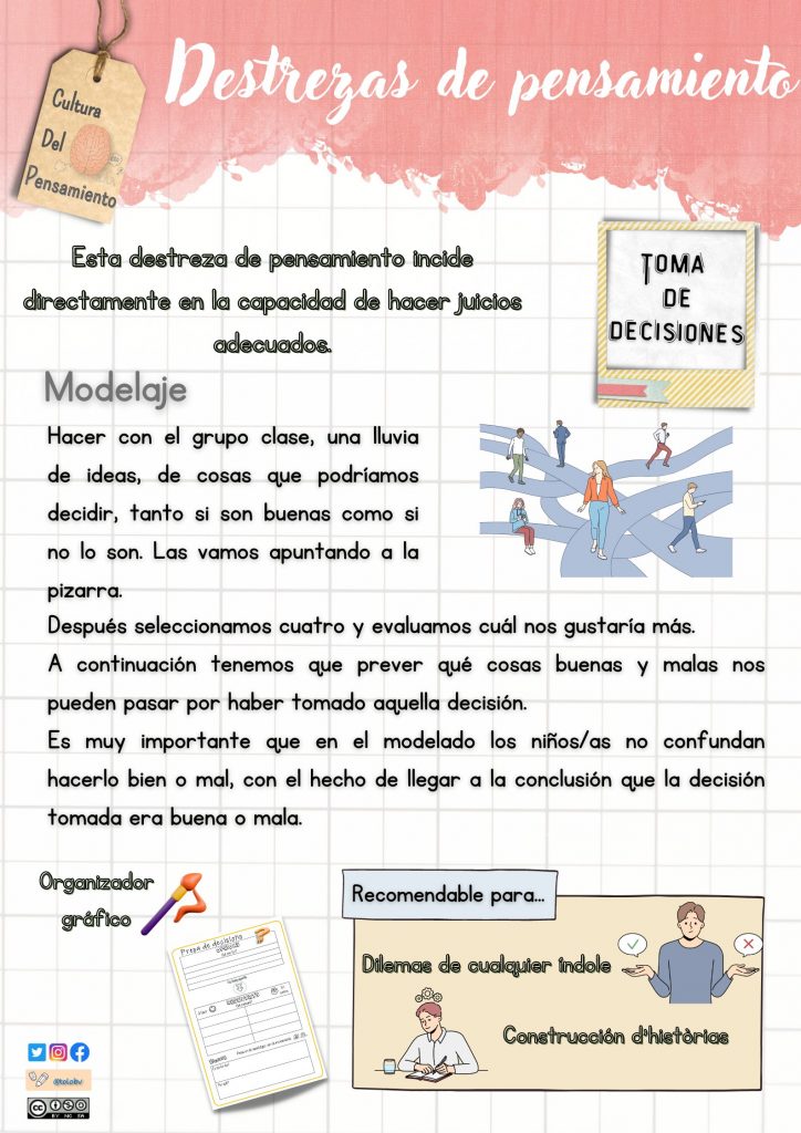 La destreza de pensamiento de toma de decisiones permite que el alumnado piense de forma crítica, valore criterios y elija con sentido. Es una excelente manera de hacer visible el pensamiento, generar diálogo y fomentar la autonomía. Al aplicarla de forma sistemática, ayudamos a nuestros estudiantes a ser más reflexivos, responsables y conscientes de sus elecciones tanto dentro como fuera del aula..