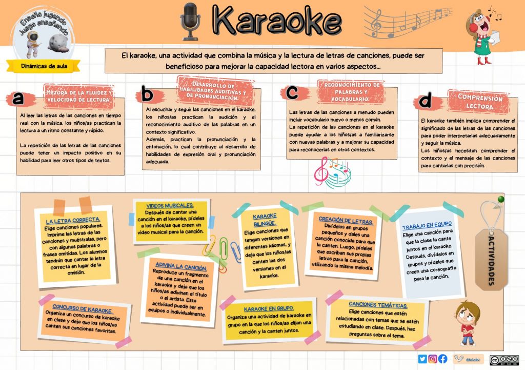 El karaoke, como dinámica de aula, es una actividad que combina música y lectura, lo cual puede ser beneficioso para mejorar diversas habilidades lectoras en los estudiantes de primaria. En la imagen se destacan los siguientes aspectos: