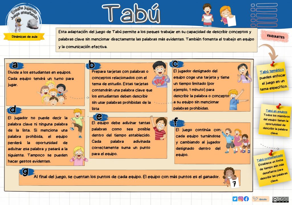 - Tabú temático: Limita las palabras a un tema específico, como ciencias, matemáticas o literatura, para trabajar vocabulario específico de la asignatura.