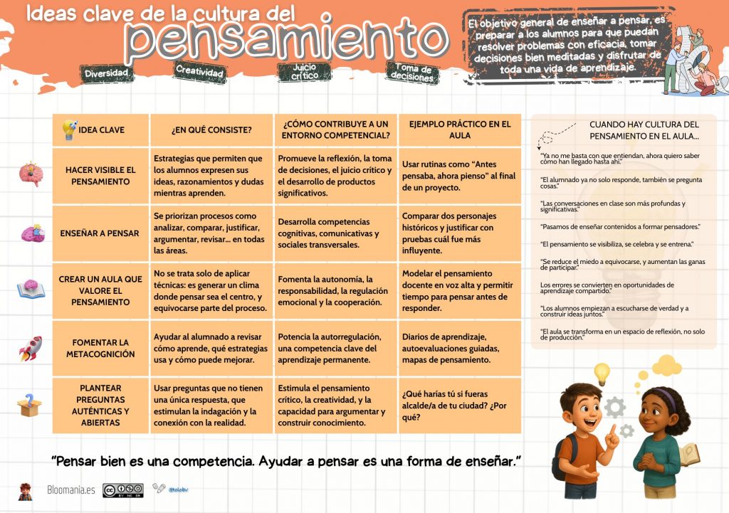 Enseñar a pensar no es un añadido ni una moda pasajera: es el corazón de una educación verdaderamente significativa. La cultura del pensamiento propone un cambio profundo en la manera de entender el aprendizaje. No se trata solo de aplicar rutinas o hacer visibles ciertos procesos, sino de generar un clima donde pensar sea lo esperado, lo valorado y lo habitual. En esta cultura, el error se convierte en una oportunidad para aprender, las preguntas auténticas cobran protagonismo, y se prioriza el desarrollo del juicio crítico, la toma de decisiones, la creatividad y la metacognición. Todo ello no sustituye a los contenidos, sino que les da profundidad y sentido.