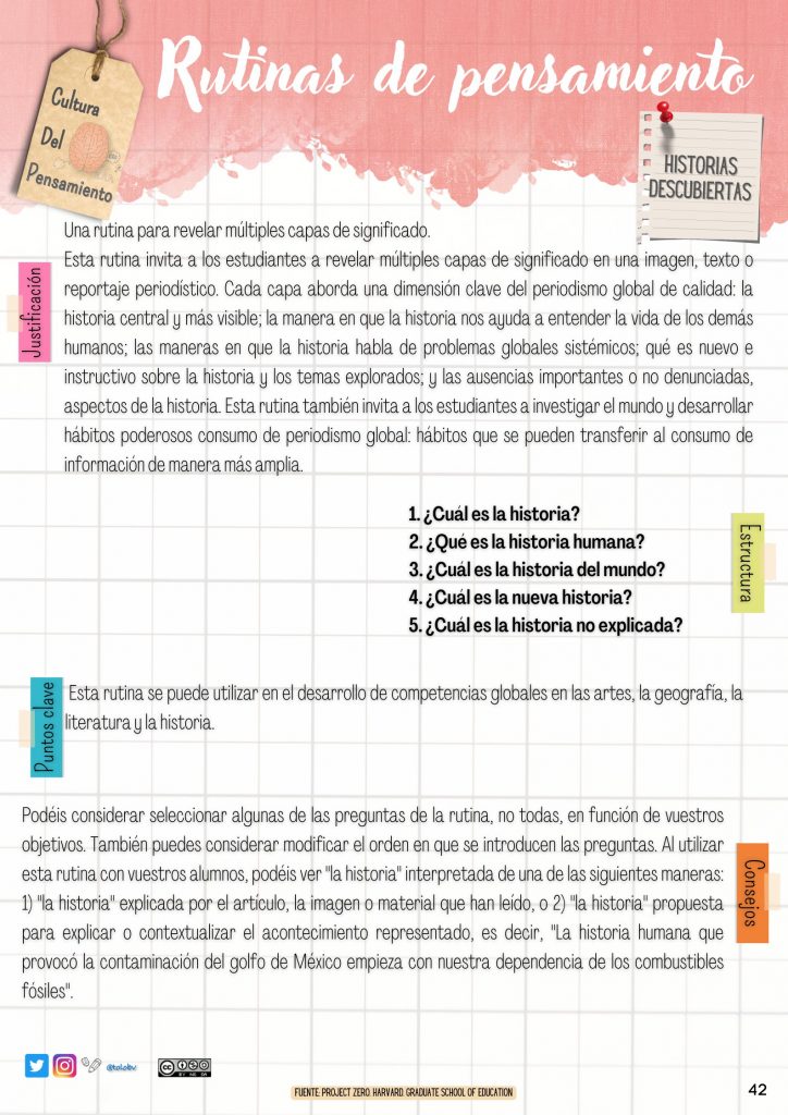La rutina de pensamiento «Historias descubiertas» está diseñada para ayudar a los estudiantes a descomponer y analizar las distintas capas de significado presentes en una imagen, texto o reportaje periodístico. Se basa en preguntas clave que invitan a explorar diferentes niveles de interpretación, fomentando la reflexión profunda y el desarrollo de competencias de pensamiento crítico y global.