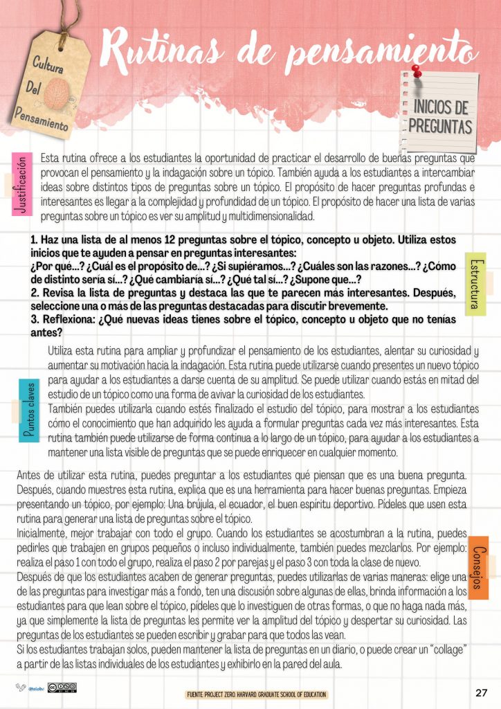 En el aula, no hay nada más valioso que el aprendizaje activo. Para fomentar el pensamiento crítico y la curiosidad en los estudiantes, las rutinas de pensamiento son una herramienta eficaz y sencilla que permite explorar temas de manera profunda. En esta ocasión, vamos a analizar una rutina conocida como «Inicios de preguntas», desarrollada en el marco de Project Zero de la Harvard Graduate School of Education, que ayuda a los estudiantes a generar preguntas profundas y multidimensionales sobre cualquier tema, concepto u objeto.