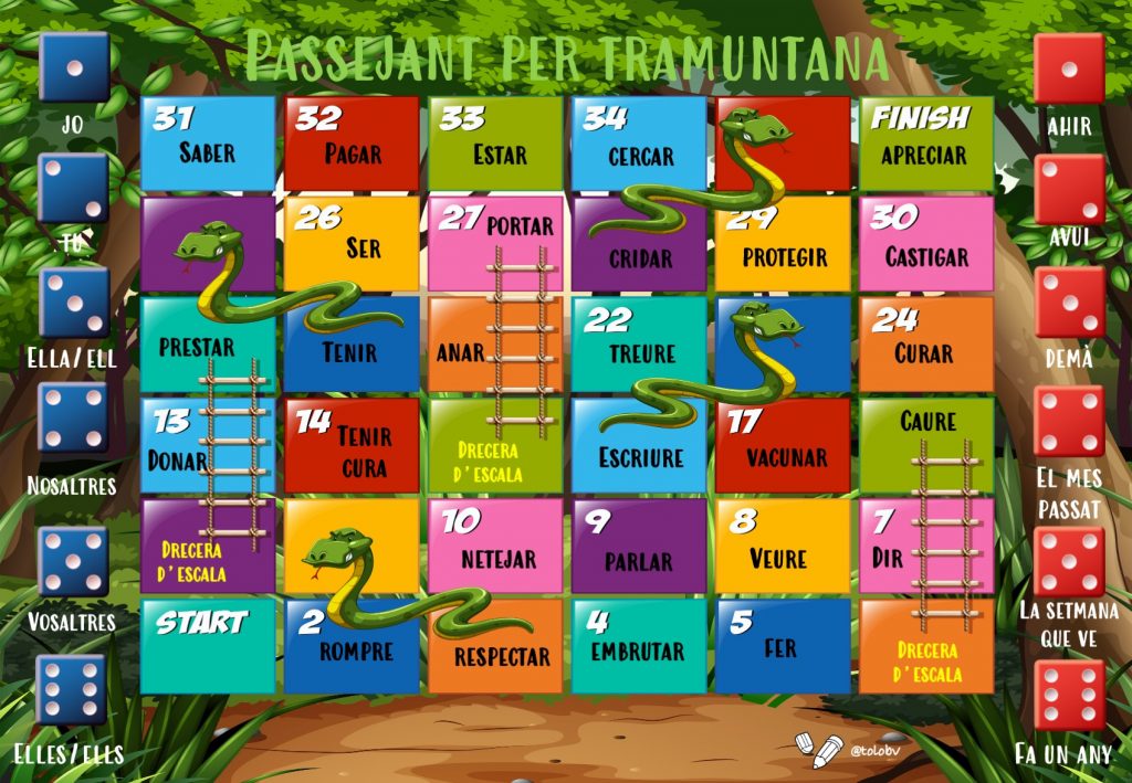 El objetivo de «Paseando por Tramuntana» es practicar la conjugación verbal de manera divertida. Los alumnos tendrán que lanzar tres dados: