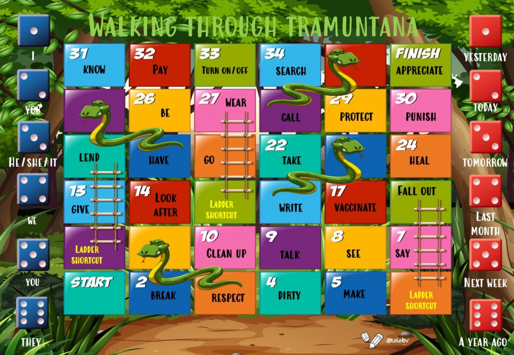 En cada casilla hay un verbo con el que los jugadores deberán construir una frase siguiendo las indicaciones de los dados.