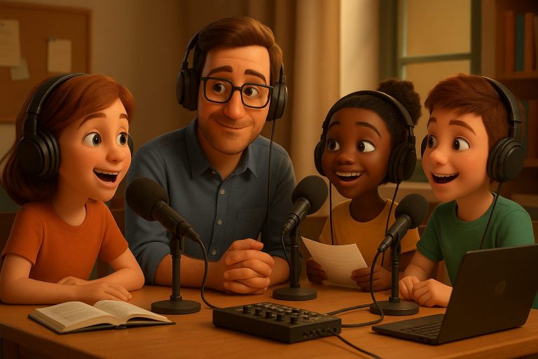 La lectura radiofónica o podcast lector transforma el aula en un pequeño estudio sonoro. Los textos cobran vida, las voces narran, los efectos acompañan… y la comprensión se vuelve experiencia auditiva.