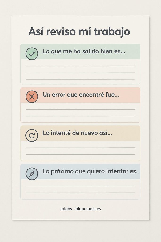 La plantilla “Así reviso mi trabajo” es una herramienta de autorreflexión diseñada para que el alumnado tome conciencia de su proceso de aprendizaje, especialmente en momentos de error, revisión o mejora. A través de preguntas guiadas, invita a pensar más allá del resultado final y a mirar con amabilidad aquello que no salió como esperaban.